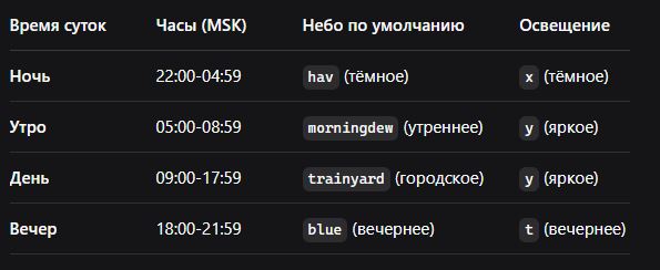 [SkyControl] MSK Time: 14:00 | Sky: trainyard | Light: y | SkyChange: 1 | LightChange: 1