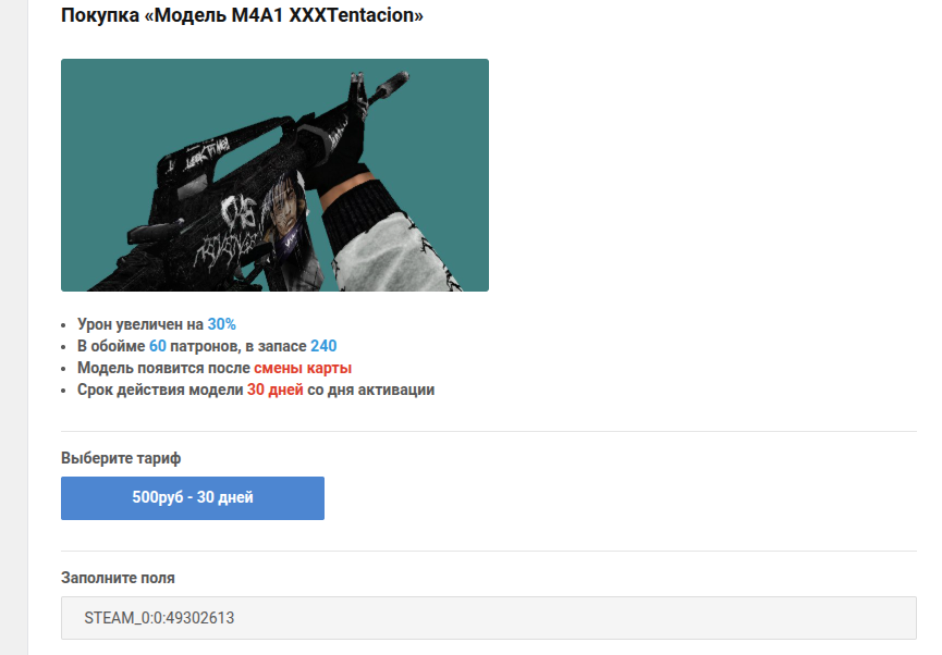 Всем привет! Мне нужен плагин, который продает оружие по SteamID через GameCMS по rcon команде. Чтобы можно было указать срок действия, урон, обойму и скин. Я знаю, что такой плагин существует, но но знаю кто автор. Собственно вопрос в стоимости. Прикладываю пример для наглядности, может не совсем ясно описал: